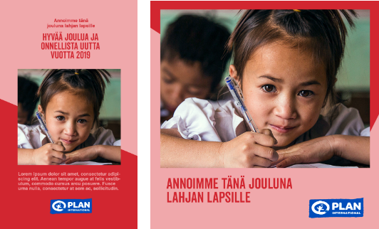 Tee lahjoitus heikoimmassa asemassa olevien lasten, erityisesti tyttöjen puolesta. Samalla saat käyttöösi sähköiset joulukortit- ja viestintämateriaalit sidosryhmiäsi varten.